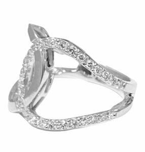 Designer two half circles crossed ring in 14 k white gold and yellow gold. The diamond weight is .50 carat. The diamond clarity is s I 1. The diamond color -s g-h. The finish is rhodium. The size is 6.5. The width of the ring is 23.5. The height is 21.5. The diamond weight is approaximately .42 carats.