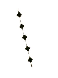 Five -clover onyx bracelets in 14k yellow gold. The closure for the bracelet is lobster claw. The total length of the bracelet is seven inches. The clover is 16 mm. The onyx is cut specially for each clover. The bracelet is 7 inches. The bracelet is connected to the chains