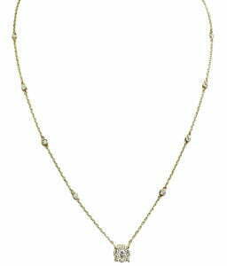 invisible setting diamond -necklace is in 14 k yellow or white gold. The diamonds have a total carat weight of 0.85 carats. The gold weight is 3.6 grams. The diamonds on the chain are burnish set. The diamonds in the necklace are a pressure point invisible look setting.