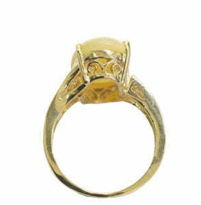Oval opal ring in 14 k yellow gold. The diamond weight is .03 carat. The diamond clarity is S-I-1. The diamond color is G-h. the setting is prong and pave. The opal size is 13 x 10. The weight of the opal is 2.70 carats.
