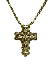 Mini- diamond cross in 14k-yellow gold. The total diamond weight is .10 carat. The chain is cable. The diamond is si1 and the color is G-H. The finish is high polish.
