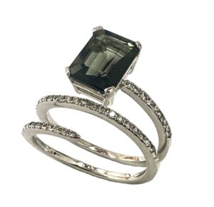 Octagon Emerald cut swirled diamond ring in 14k white gold. The weight of the gold is 4 carats. The oct-agon green tourmaline weight is 2.4 carats. The weight of the diamond is .27 carats. The diamond is S I 1. in clarity and G_H in color. The setting of the diamond is pave. The finish is rhodium.