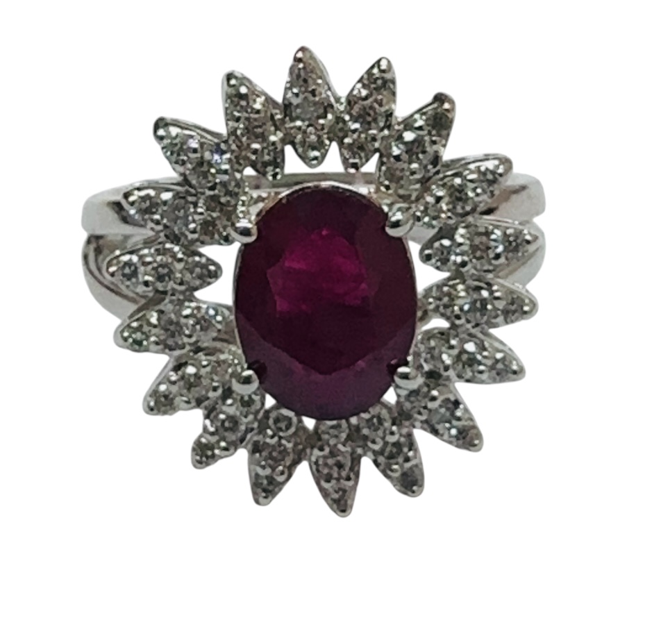 Oval ruby and white diamond rings. The gold is in 14k white gold The diamonds arensi-1 in clarity and G_H in color. The center diamond is diamonds. The finish is rhodium.