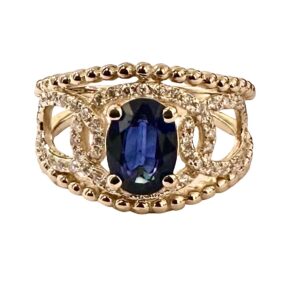 Round Oval Emerald diamond ring in 14 k yellow gold. The diamond setting is pave. The diamond weight is .23 carats. The diamond clarity is sI1. The diamond color is g-h. The ruby is 8×6 and the weight of this Burma ruby is 1.77 carats.