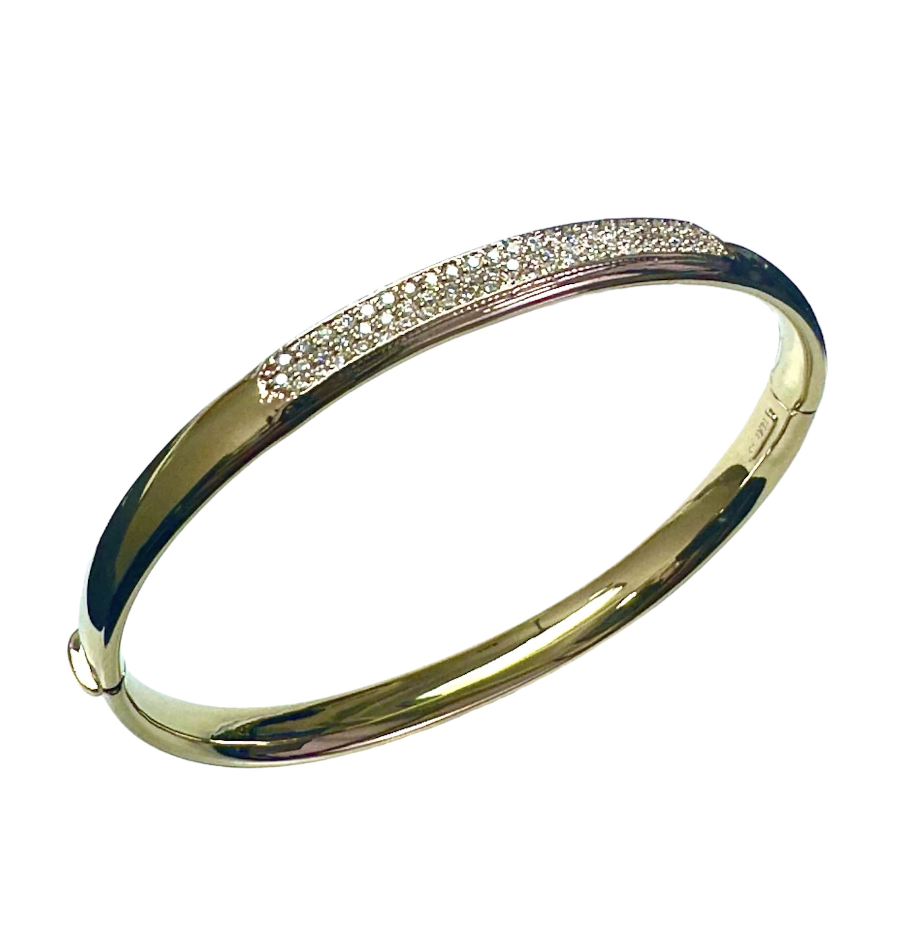 Round shape diamond bangle in 14k two tone. The total diamond weight is .55. The diamonds are 1.2 mm. carat. The total gold weight is 12.2 grams. The setting of diamonds is pave. The shape of the bangle is round.