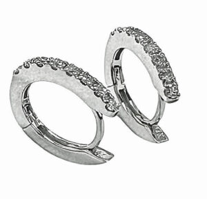 Small oval Huggies diamond earrings in 14k white gold. The length of the earrings is 13 mm. The width of the earrings is 12 mm. The total diamond weight is .28 carats. The diamond clarity is S-I1. The color is G-H. The setting is in pave’. The finish is high polish with rhodium plating.